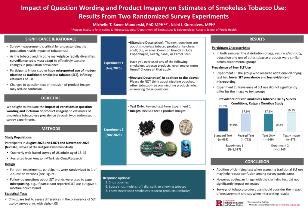 Michelle Bover Manderski Rutgers Institute for Nicotine & Tobacco Studies; Department of Biostatistics & Epidemiology, Rutgers School of Public Health] Impact of question wording and product imagery on estimates of smokeless tobacco use: Results from two randomized survey experiments]