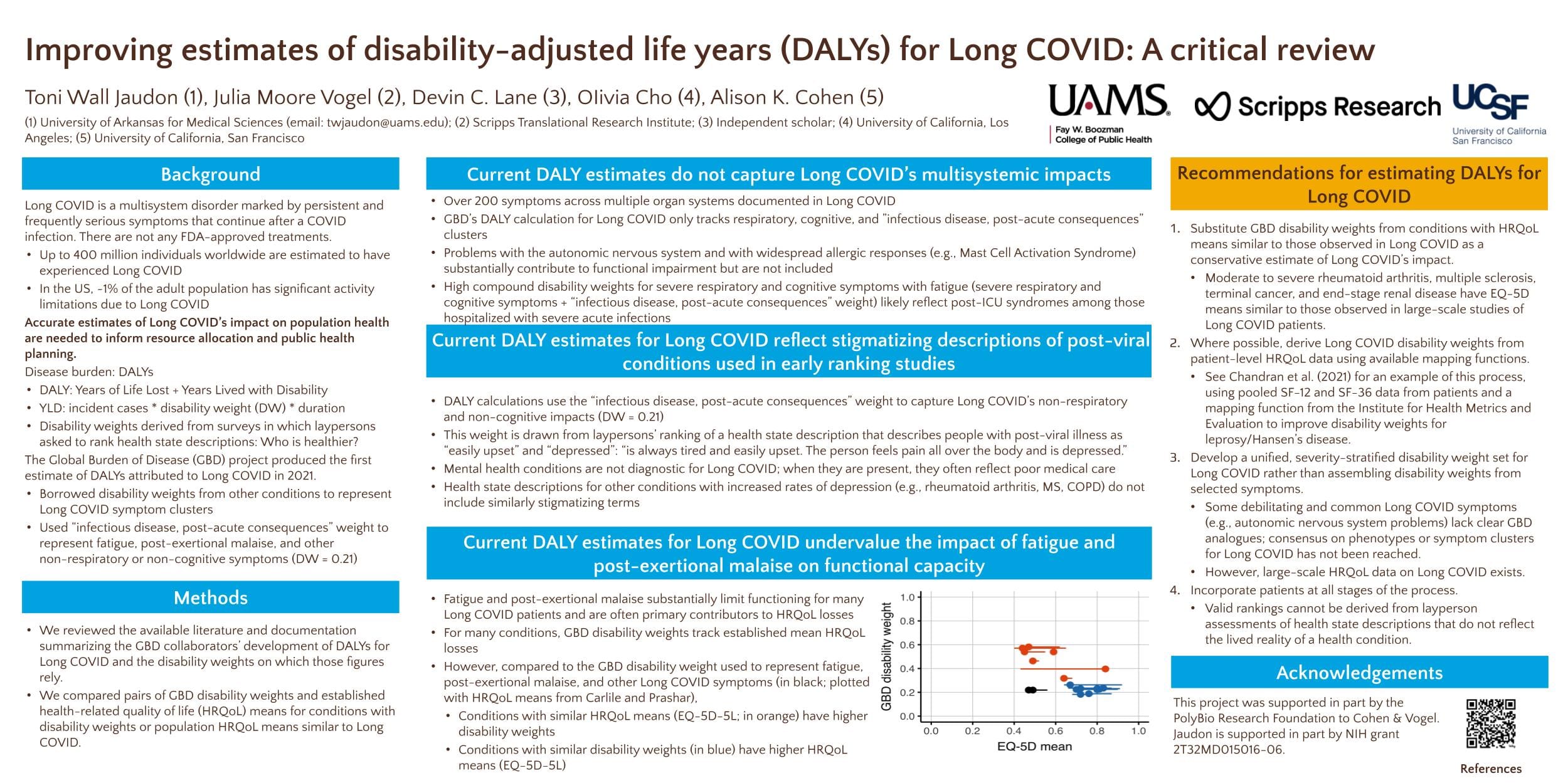 Toni Jaudon University of Arkansas for Medical Sciences] Improving estimates of disability-adjusted life years for Long COVID: A critical review]